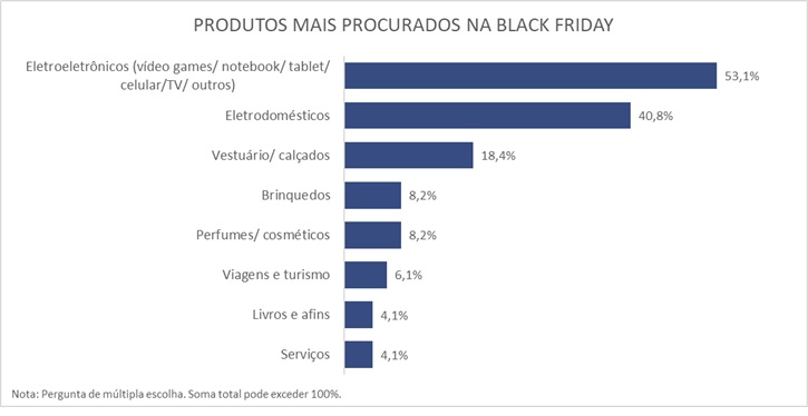 Os principais produtos adquiridos durante a Black Friday na região são os eletroeletrônicos (videogames, notebooks, celulares, TVs e tablets), que correspondem a 53,1% das intenções de compra. Na sequência estão os eletrodomésticos, com 40,8%, além de itens de vestuário e calçados (18,4%), perfumes e cosméticos (8,2%), brinquedos (8,2%) e viagens e turismo (6,1%).