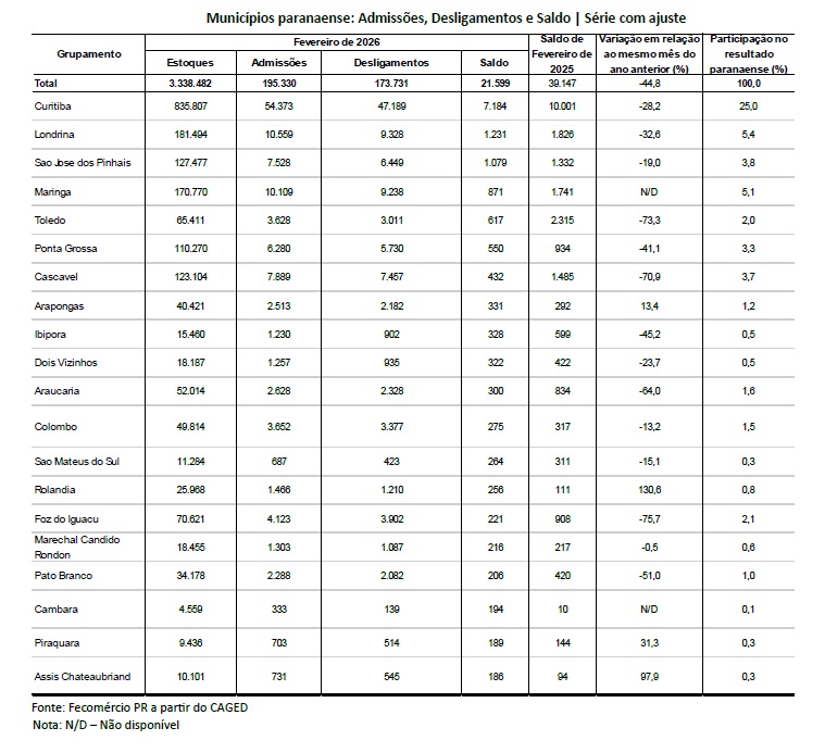 O Paraná registrou desaceleração na geração de empregos formais em fevereiro de 2026, conforme aponta o Boletim do Emprego da Fecomércio PR, elaborado com base em dados do Cadastro Geral de Empregados e Desempregados (Caged). No período, foram criadas 21.599 vagas com carteira assinada, resultado de 195.330 admissões e 173.731 desligamentos. O saldo é 44,8% inferior ao registrado em fevereiro de 2025, quando foram abertas 39.147 vagas.
