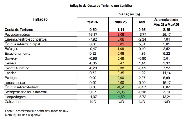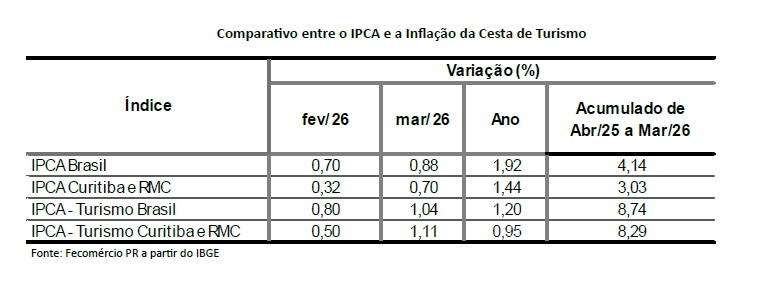 Apesar da elevação registrada em março, o desempenho acumulado do primeiro trimestre indica um cenário mais favorável para o turismo no Paraná. Entre janeiro e março, a inflação do setor em Curitiba e Região Metropolitana foi de 0,95%, abaixo da média nacional de 1,20%.