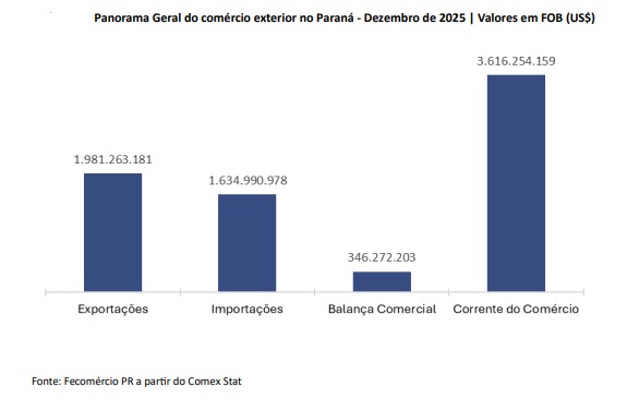 A balança comercial do Paraná apresentou um desempenho histórico em 2025, com crescimento de 1,22% nas exportações e manutenção do saldo positivo ao longo do ano. De janeiro a dezembro, o estado exportou US$ 23,6 bilhões, segundo dados do Comex Stat, do Ministério do Desenvolvimento, Indústria, Comércio e Serviços (MDIC), analisados pelo Boletim do Comércio Exterior da Federação do Comércio de Bens, Serviços e Turismo do Paraná (Fecomércio PR).