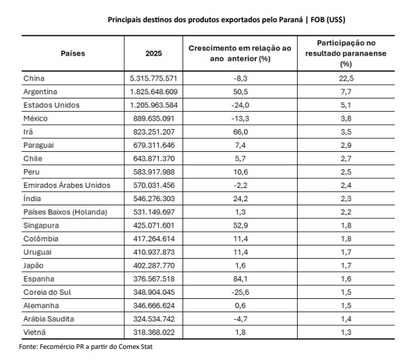 Em 2025, os principais destinos das exportações paranaenses foram China, Argentina, Estados Unidos, México e Irã. Embora a China tenha reduzido em 8,3% suas compras, o país permaneceu como o principal mercado de destino, respondendo por 22,5% do total exportado pelo estado. A queda foi parcialmente compensada pelo aumento das exportações para países como Argentina, Irã e Espanha, que ampliaram suas compras em 50%, 66% e 84%, respectivamente. Também houve crescimento das exportações para Singapura, Peru e Paraguai. Entre os produtos mais demandados por esses mercados estão milho não moído, veículos automóveis, óleos de petróleo, farelo de soja, adubos, açúcares e melaço.