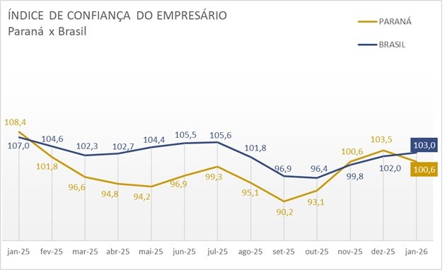 O movimento no Paraná contrasta com o cenário nacional, onde o ICEC avançou 0,9% em janeiro, alcançando 103 pontos. Ainda assim, mesmo com a alta mensal, o índice nacional permanece 3,8% abaixo do patamar registrado no início de 2025, indicando que a recuperação da confiança dos comerciantes segue limitada no país.