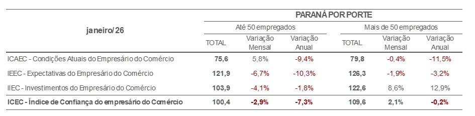 Os empresários do comércio paranaense iniciaram 2026 com redução no nível de confiança. O Índice de Confiança do Empresário do Comércio (ICEC), apurado pela Confederação Nacional do Comércio de Bens, Serviços e Turismo (CNC) em parceria com a Federação do Comércio de Bens, Serviços e Turismo do Paraná (Fecomércio PR), recuou 2,8% em relação a dezembro e marcou 100,6 pontos em janeiro. Na comparação com janeiro de 2025, o indicador apresenta queda mais expressiva, de 7,2%.