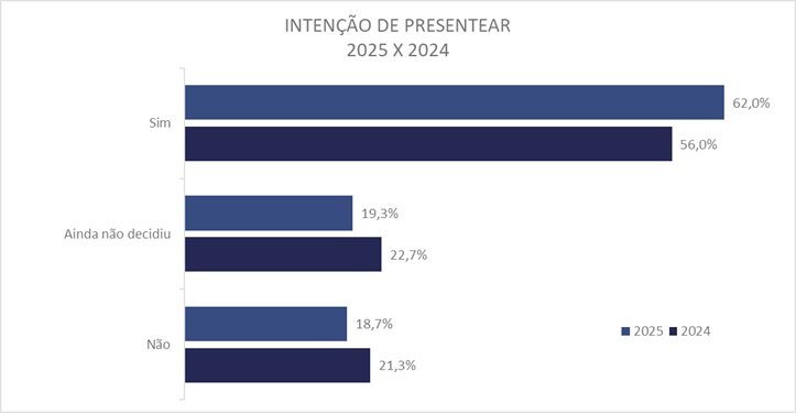 O cenário pode mudar nas próximas semanas, já que 19,3% dos entrevistados ainda estão indecisos. Esse grupo representa uma parcela significativa e tende a ser influenciado pelo clima natalino, que ganha força nas vitrines e nas ruas.
