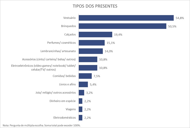 Os itens de vestuário são a principal escolha dos consumidores da região, com 54,8%. Também se destacam brinquedos (50,5%), calçados (19,4%), perfumes e cosméticos (15,1%), lembrancinhas e artesanato (14%), acessórios (10,8%) e eletroeletrônicos (10,8%).