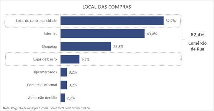 O comércio de rua aparece como principal canal de compra, somando lojas do centro e de bairro, com 62,4% das citações, percentual superior ao da internet, que deve representar 43%. Os shoppings devem responder por 25,8% do movimento.