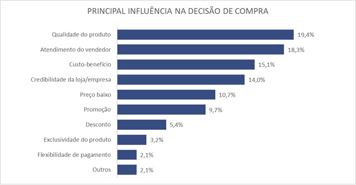 A pesquisa de preços é rotina para 72,5% dos consumidores da região, e a internet é o principal meio para comparação, utilizada por 74,2% dos que consultam valores. Os fatores que mais influenciam a decisão final são qualidade do produto (19,4%), atendimento do vendedor (18,3%), custo-benefício (15,1%), credibilidade da loja (14%), preço baixo (10,7%) e promoção (9,7%).