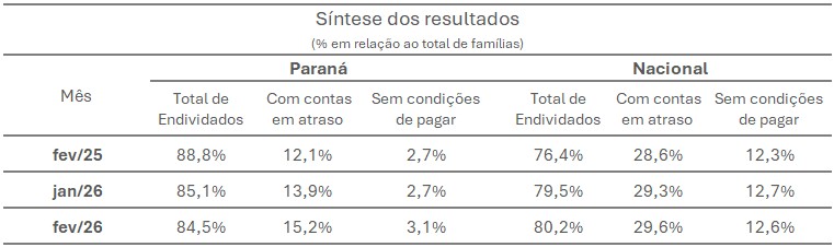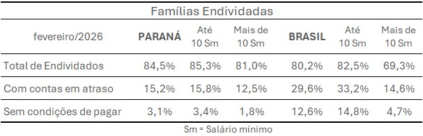 Quando o tema é inadimplência, o estado apresenta uma situação mais favorável em comparação com o restante do país. O Paraná aparece na penúltima posição no ranking nacional de famílias inadimplentes, ficando atrás apenas da Paraíba. Mesmo assim, o percentual de consumidores com contas em atraso registrou leve aumento, passando de 13,9% em janeiro para 15,2% em fevereiro. Também houve crescimento na parcela de famílias que afirmam não ter condições de pagar suas dívidas, que subiu de 2,7% para 3,1% no período.