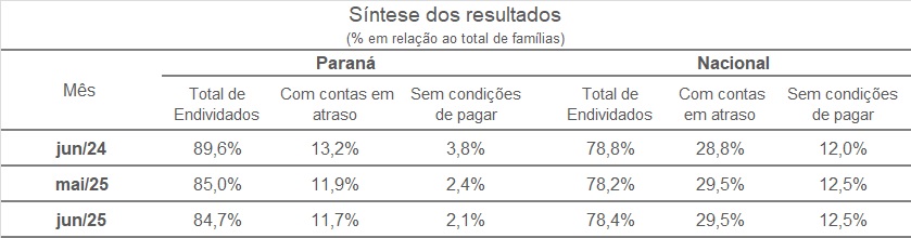 A Pesquisa de Endividamento e Inadimplência do Consumidor (PEIC), realizada pela Confederação Nacional do Comércio de Bens, Serviços e Turismo (CNC) em parceria com a Federação do Comércio de Bens, Serviços e Turismo do Paraná (Fecomércio PR), revela que o Paraná mantém a trajetória de redução no endividamento das famílias ao longo deste ano. No mês passado, 84,7% dos lares paranaenses possuíam algum tipo de dívida, percentual inferior aos 85% registrados em maio e significativamente menor do que os 89,6% verificados em junho de 2024.