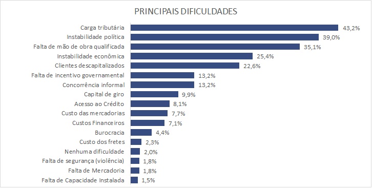 A falta de mão de obra qualificada surge como um dos gargalos estruturais mais relevantes. Com 35,1% das menções, e alta de 4,5 pontos percentuais em relação ao semestre passado, figura entre os níveis mais elevados dos últimos 12 anos, evidenciando um problema recorrente do setor terciário. Também estão na lista de dificuldades a instabilidade econômica e a percepção de clientes descapitalizados.