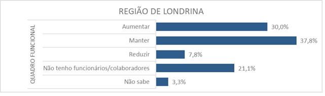 Londrina destaca-se pela intenção de contratação acima da média estadual. O percentual de empresários que planejam ampliar o quadro funcional chega a 30%, patamar semelhante ao de Curitiba (30,5%) e superior à média do Paraná (25,9%). A maioria, contudo, deve optar pela manutenção das equipes (37,8%), ao passo que 7,8% projetam cortes.