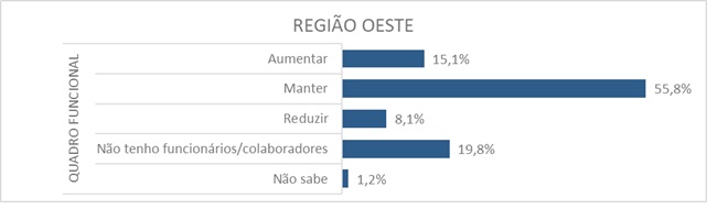 A intenção de ampliar o quadro funcional é mais contida na região Oeste: 15,1% dos empresários pretendem contratar, enquanto 55,8% indicam manutenção do quadro atual. Outros 8,1% avaliam reduzir o número de colaboradores. O conjunto dos dados aponta para um ambiente de maior prudência, com foco na preservação da estrutura existente.