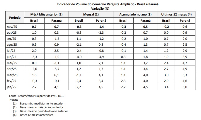 O volume de vendas do comércio varejista ampliado cresceu 0,7% em novembro no Brasil e no Paraná, na comparação com outubro de 2025. Os dados são da Pesquisa Mensal do Comércio (PMC), divulgada pelo IBGE, e indicam um movimento de recuperação pontual do setor no penúltimo mês do ano, após oscilações ao longo de 2025.