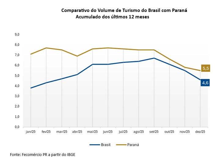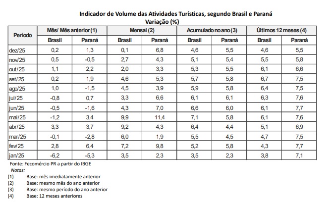 Na variação mensal, dezembro de 2025 registrou avanço de 1,3% no volume de vendas do turismo no Paraná em relação a novembro, enquanto o Brasil apresentou alta de 0,2% no mesmo período. Na comparação com dezembro de 2024, o crescimento foi de 0,1% no cenário nacional, marcando o terceiro resultado positivo consecutivo no país.