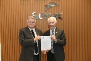 O presidente do TRE-PR, desembargador Sigurd Roberto Bengtsson, e o presidente do Sistema Fecomércio Sesc Senac PR, Darci Piana