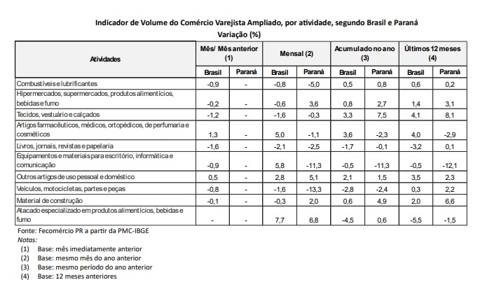 Algumas atividades do varejo ampliado paranaense apresentaram crescimento na comparação anual. Os destaques foram o atacado especializado em produtos alimentícios, bebidas e fumo (6,8%), outros artigos de uso pessoal e doméstico (5,1%) e hipermercados e supermercados, incluindo alimentos, bebidas e fumo (3,6%).